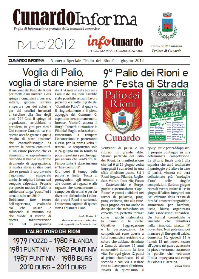 A questo link trovate il numero integrale di Cunardo Informa “Speciale palio 2012” Condividi: Fai clic per condividere su X (Si apre in una nuova finestra) X Fai clic per condividere su Facebook (Si apre in una nuova finestra) Facebook Mi piace Caricamento... Correlati